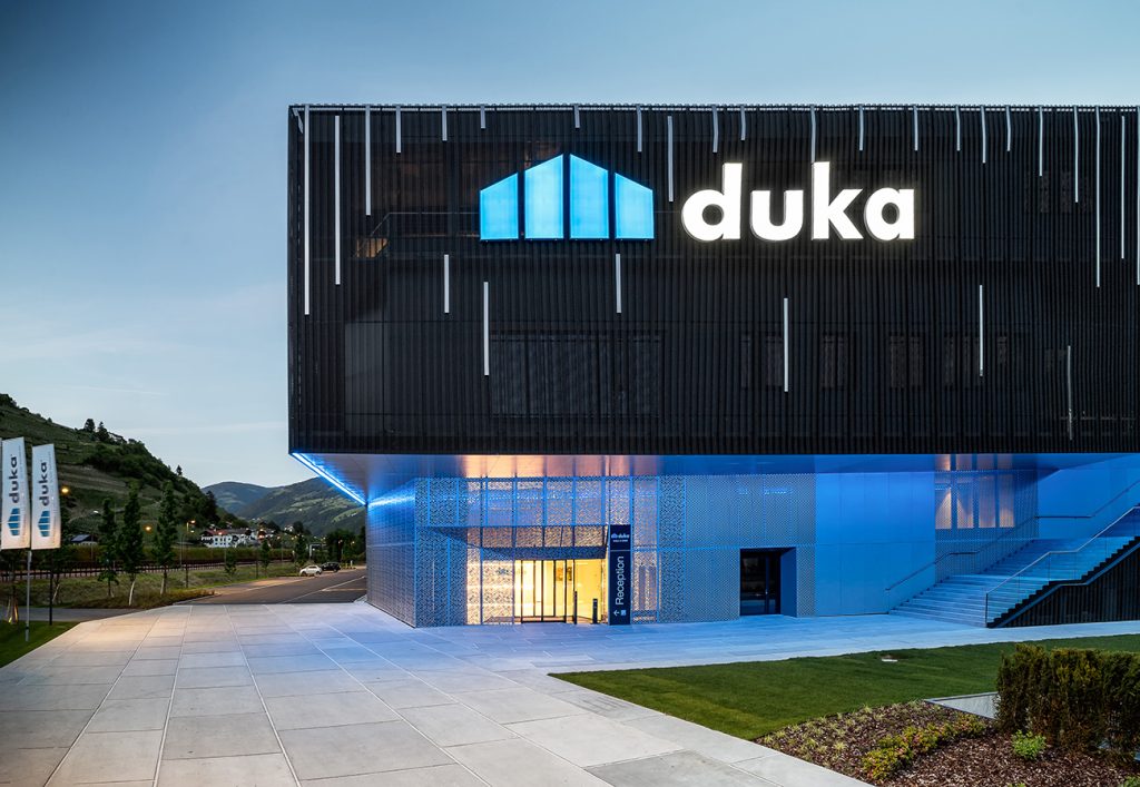 Il concorso per la nuova sede aziendale è stato vinto dallo studio KUP Architekten di Bressanone, che ha progettato il volume dell’edificio come una grande forma uniforme. In collaborazione con l’interior designer Bea Mitterhofer, abbiamo potuto partecipare alla pianificazione, alle gare d’appalto e alla direzione dei lavori degli interni dei mondi Duka. Questo include le intere parti rappresentativi con entrata, reception, zona bar, sale riunioni, servizi igienici, scale, sale di formazione, la mensa aziendale e l’area espositiva, dove vengono presentate 170 cabine doccia con diverse soluzioni di installazione. Molte idee progettuali giocano con il tema dell’acqua e con le goccioline d’acqua. Il mondo Duka si rivolge principalmente ai clienti del commercio all’ingrosso e ai loro clienti: i commercianti specializzati e gli architetti. Arrivano alla fabbrica di Bressanone e percorrono un viaggio affascinante. Un percorso che si sviluppa attraverso i reparti di produzione e si conclude con la visita alla mostra. La esposizione è completata da sale di formazione per il montaggio. Qui vengono presentati al cliente i dettagli e il corretto montaggio delle cabine doccia.